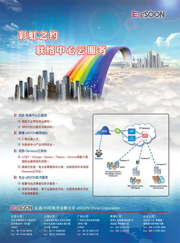 億迅(中國)軟件有限公司:"億迅(中國)軟件有限公司(eSOON)"是eSOON Cayman 集團控股公司與eSOON BVI投資營運公司在中國大陸投資的全資子公司,也是其拓展大中國區(qū)業(yè)務的據(jù)點。自2001年在上海成立至今,已在全國各地14個城市設有分公司或辦事處,為超過350家的客戶提供本地化的呼叫中心系統(tǒng)建設和運營管理的專業(yè)服務,其中不乏橫跨各個領(lǐng)域的頂尖企業(yè)。億迅一直秉承客戶至上的服務精神融入企業(yè)的業(yè)務發(fā)展和日常經(jīng)營中。