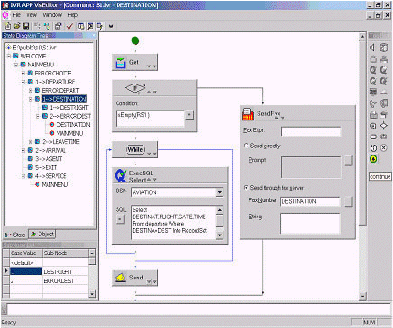 為了最大限度地方便用戶, Visual Editor 為 IVR 腳本的編寫提供了一整套可視化的圖形工具. 在它的集成開發(fā)環(huán)境中, 你可以執(zhí)行定義一套語音文件, 定義和初始化一些變量, 定義 DSN 和一些記錄集, 加入新結(jié)點(diǎn)等操作.