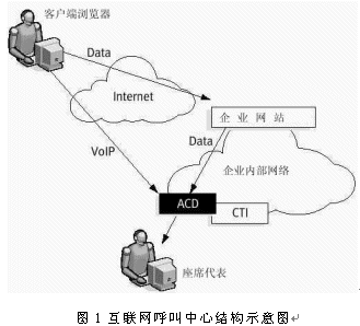 互聯(lián)網(wǎng)呼叫中心是在互聯(lián)網(wǎng)技術(shù)飛速發(fā)展的基礎(chǔ)上所產(chǎn)生的。對于客戶而言,完全的互聯(lián)網(wǎng)呼叫中心和傳統(tǒng)呼叫中心最大的區(qū)別就在于客戶無需電話,只要從一個Web站點就可以直接進入互聯(lián)網(wǎng)呼叫中心。這樣一來,呼叫中心就從傳統(tǒng)形式上的“撥號-交談(Dial to Talk)”發(fā)展到現(xiàn)代形式的“點擊-交談(Click to Talk)”。典型的互聯(lián)網(wǎng)呼叫中心結(jié)構(gòu)如圖1所示。