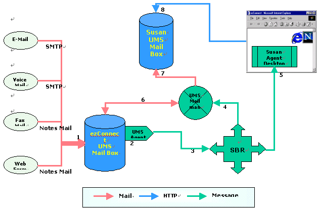 各類外部語音、郵件、WEB、傳真等信息進入呼叫中心會以相應的格式直接被放入ezConnect統(tǒng)一郵件服務器(1),消息經(jīng)過UMS Agent 模塊被提取出信息主題和關鍵字(2),這些主題和關鍵字被送入基于技能的路由選擇模塊SBR(3),由SBR進行分析,選擇出最合適服務的座席(例如是Susan);之后SBR通知郵件轉發(fā)器(4)去ezConnect統(tǒng)一郵件服務器中取相應的郵件(6),將郵件放入最佳座席(Susan)的UMS信箱中(7)(8),與此同時座席Susan的界面上顯示出她有一封新的郵件(5)。至此,完成了座席Susan 接收UMS信件的全過程。