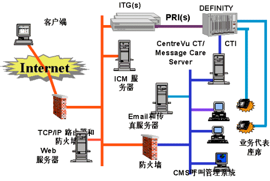 Internet呼叫中心(Internet Call Center簡(jiǎn)稱(chēng)ICC)是當(dāng)前的一個(gè)明顯趨勢(shì)。支持因特網(wǎng)作為呼叫中心的訪問(wèn)渠道會(huì)極大增強(qiáng)呼叫中心的可用性。Internet用戶(hù)可以通過(guò)主頁(yè)瀏覽、電子郵件、在線Chat、IP語(yǔ)音電話等方式與話務(wù)員建立在線聯(lián)系,得到優(yōu)質(zhì)的服務(wù)。AVAYA的Internet呼叫中心解決方案支持用戶(hù)采用一條電話線進(jìn)行因特網(wǎng)和IP電話的訪問(wèn),ICM管理器與Web服務(wù)器建立連接,將到來(lái)的IP呼叫進(jìn)行自動(dòng)分配,ITG IP電話網(wǎng)關(guān)實(shí)現(xiàn)將IP語(yǔ)音流轉(zhuǎn)換成語(yǔ)音信號(hào),經(jīng)E1線送到Definity交換機(jī)后傳到話務(wù)員座席。座席和用戶(hù)可實(shí)現(xiàn)瀏覽器同步等功能。
