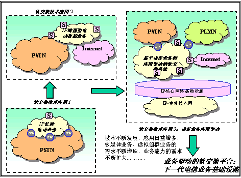 業(yè)務(wù)驅(qū)動的軟交換平臺通過對會話協(xié)議體系、接入/互連控制、業(yè)務(wù)控制、應(yīng)用控制、內(nèi)容控制以及對網(wǎng)絡(luò)的控制提供開發(fā)和管理新業(yè)務(wù)的全面解決方案。電信運(yùn)營商通過這個平臺,可以從最基本的業(yè)務(wù)開始(例如電話業(yè)務(wù))逐漸發(fā)展軟交換的體系結(jié)構(gòu)、不斷開發(fā)和引入新的應(yīng)用和新的業(yè)務(wù),推動電信網(wǎng)絡(luò)和業(yè)務(wù)的不斷發(fā)展。