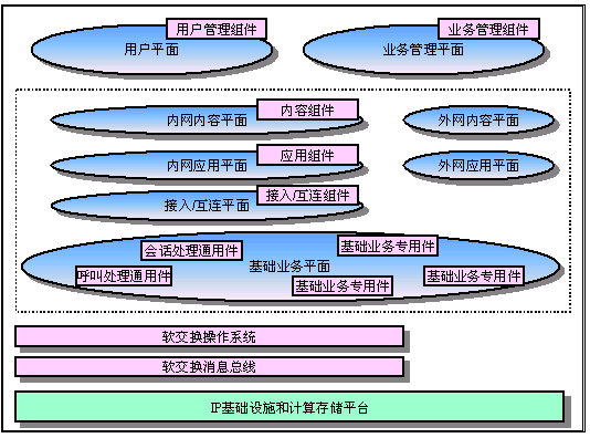 從結(jié)構(gòu)上看,業(yè)務(wù)驅(qū)動的軟交換平臺是一個復(fù)雜的多域多層組件平臺。一個電信業(yè)務(wù)的實現(xiàn)是對平臺上的組件的組裝過程。業(yè)務(wù)驅(qū)動的軟交換平臺上的組件分為用戶平面、基礎(chǔ)業(yè)務(wù)平面、接入/互連/移動控制平面、應(yīng)用平面、內(nèi)容平面和業(yè)務(wù)管理平面。用戶平面的組件負(fù)責(zé)維護(hù)用戶的注冊信息、位置信息、狀態(tài)信息、業(yè)務(wù)信息和業(yè)務(wù)使用信息;A(chǔ)業(yè)務(wù)平面的組件分為三大類型:電路基礎(chǔ)業(yè)務(wù)、包交換基礎(chǔ)業(yè)務(wù)和多媒體交換基礎(chǔ)業(yè)務(wù)。每個基礎(chǔ)業(yè)務(wù)分成傳輸層、承載層、媒體層、呼叫處理層和業(yè)務(wù)層,其中的控制包括了對各層功能的控制協(xié)議和層間交互的控制協(xié)議。接入/互連/移動控制平面中包含了對各種接入網(wǎng)絡(luò)的控制、對互聯(lián)網(wǎng)絡(luò)的控制和對移動性的控制協(xié)議,也分成傳輸層、承載層、媒體層、呼叫處理層和業(yè)務(wù)層的控制組件。應(yīng)用平面的組件分為三種類型,基于傳統(tǒng)智能網(wǎng)(IN,