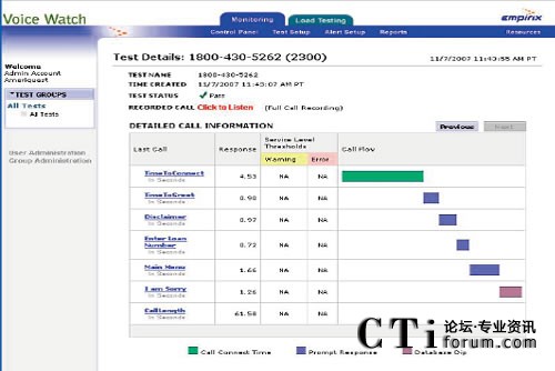 Voice Watch® 是一種主動的客戶體驗管理解決方案,它從呼叫者的角度來監(jiān)測端到端語音業(yè)務和系統(tǒng)設施的性能–從PSTN接入,通過IVR,轉接到人工坐席。Voice Watch發(fā)起有規(guī)律的周期性呼叫測量承載網(wǎng)的性能、主機和數(shù)據(jù)庫的響應時間、語音提示的正確性、動態(tài)數(shù)據(jù)的準確度、通話質(zhì)量、呼叫路由、排隊時間、屏幕彈出窗口的正確性和及時性。一旦檢測到新問題,Voice Watch立即向相關的技術人員發(fā)出告警,并報告性能問題發(fā)生的位置和類型。此外,每一個監(jiān)測電話的性能指標,包括失效事件的語音記錄,可以立即被發(fā)布到Web上以便用戶能夠診斷和修復緊急問題。用戶還可以使用這個系統(tǒng)自動生成匯總的管理報告和詳細的技術報告,可以和性能基準和性能問題相比對,并且有助于把握時機持續(xù)改善性能。