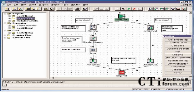 呼叫中心測試的第一步就是要?jiǎng)?chuàng)建要被測試的業(yè)務(wù)的呼叫流程圖?梢酝ㄟ^一個(gè)含有標(biāo)準(zhǔn)呼叫流程圖標(biāo)庫的呼叫流程圖形編輯器創(chuàng)建呼叫流程圖。每個(gè)呼叫流程的圖標(biāo)都包含一段Hammer
