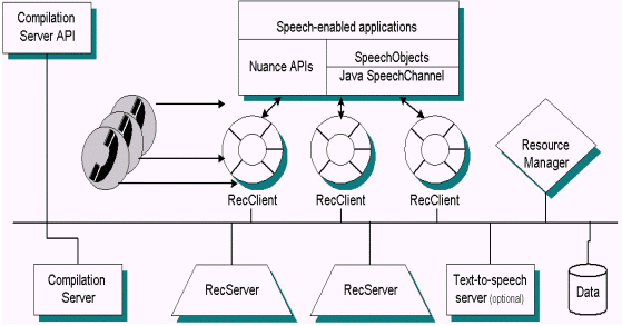 Nuance系統(tǒng)基于開放式客戶/服務機結(jié)構(gòu),特別為大型應用程序所需的健壯性和可伸縮性而設計。呼叫者的講話由客戶端收集,而識別和鑒別處理的負載被平均分配到網(wǎng)絡上的多個分開的服務器上。