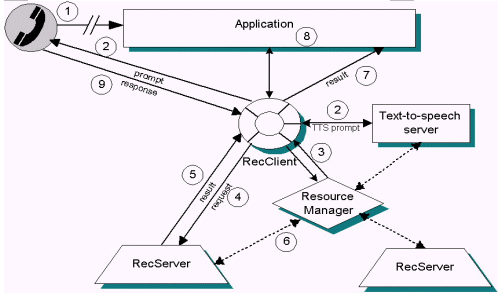 下圖說明RecServer和其它Nuance系統(tǒng)組件之間的交互情況。在每個交互過程中,由資源管理器建立連接,但RecServer和其它組件間的交互是直接進行的。