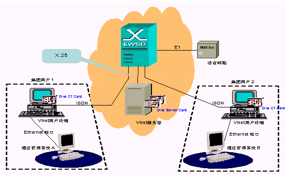 EWSD交換機(jī)提供的增強(qiáng)型CENTREX(虛擬集中用戶交換業(yè)務(wù))業(yè)務(wù)平臺VNet,能夠使運(yùn)營商在PSTN公網(wǎng)中向大客戶和重要客戶提供性能與用戶交換機(jī)PBX相似的集團(tuán)用戶解決方案.由于VNet功能基于EWSD交換機(jī), 因此能提供給用戶最大的可靠性.利用VNet豐富的性能和EWSD靈活的組網(wǎng)方案,在保證VNet的CERNTREX用戶享有PSTN公網(wǎng)的所有性能的同時(shí),可以根據(jù)用戶的特定需求提供有針對性的解決方案,完全滿足集團(tuán)用戶,商業(yè)用戶的通信需要. 此系統(tǒng)應(yīng)用了Eicon公司性能卓越的Diva ISDN Server系列產(chǎn)品。網(wǎng)絡(luò)應(yīng)用如圖所示: