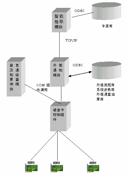 北京市建筑市場(chǎng)專家評(píng)標(biāo)抽取通知系統(tǒng)是靈訊科技有限公司采用加拿大Eicon網(wǎng)絡(luò)公司的Diva Server 4BRI 卡開發(fā)的一套高效的外撥通知系統(tǒng),該系統(tǒng)充分體現(xiàn)了Eicon網(wǎng)絡(luò)公司 Diva Server 4BRI卡強(qiáng)大的語音功能以及系統(tǒng)的穩(wěn)定性,準(zhǔn)確地識(shí)別了外撥手機(jī)的遇忙、無人、不再服務(wù)區(qū)、關(guān)機(jī)、空號(hào)等狀態(tài),實(shí)現(xiàn)了對(duì)手機(jī)狀態(tài)的全面監(jiān)控,全面解決了模擬語音卡對(duì)外撥手機(jī)信號(hào)無法判斷的問題。具體的系統(tǒng)架構(gòu)如下:Eicon公司供稿 CTI論壇編輯