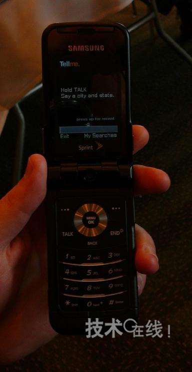 使用Tellme by Mobile檢索店鋪等時(shí)的畫(huà)面。首先,用戶(hù)可按著通話(huà)鍵說(shuō)出自己所在的町和州的名字。