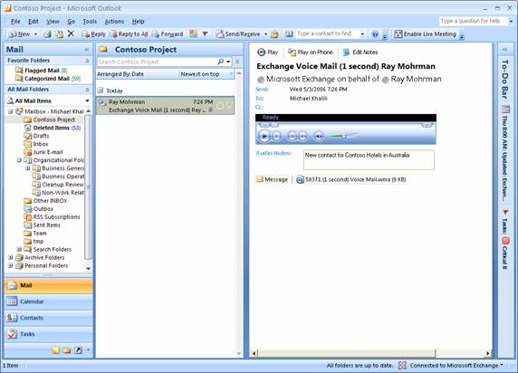 Outlook 2007,它將語(yǔ)音郵件作為優(yōu)先數(shù)據(jù)類型來(lái)集成。Outlook 2007 界面允許用戶連同其它數(shù)據(jù)項(xiàng)一起對(duì)語(yǔ)音郵件消息進(jìn)行排序、搜索和確定其優(yōu)先級(jí);此外,用戶可以在他們的座機(jī)上播放語(yǔ)音郵件消息,并向語(yǔ)音郵件消息添加附注,以便連同關(guān)聯(lián)的發(fā)件人和日期信息一起對(duì)消息內(nèi)容建立索引。(請(qǐng)參見圖2)Outlook