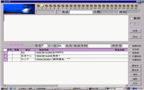 后臺(tái)主要完成對(duì)短信息的收發(fā),包括群收、群發(fā)的處理,還有生日祝福、定時(shí)發(fā)送、短信中心號(hào)碼的設(shè)置等(參見(jiàn)使用說(shuō)明書),即完成與廣播平臺(tái)無(wú)關(guān)的一些處理。