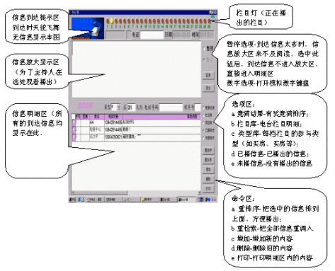 如果信息到達(dá)量過(guò)大,會(huì)導(dǎo)致信息放大區(qū)中的信息不斷被更新,此時(shí),只要選中暫停選項(xiàng),信息放大區(qū)的信息就不會(huì)被更新。該信息播出后,如果需要播出明細(xì)區(qū)中的內(nèi)容,只要在明細(xì)區(qū)中用鼠標(biāo)左鍵雙擊該信息的信息內(nèi)容,該信息內(nèi)容立即上升到放大區(qū)中,同時(shí)該信息發(fā)送人的姓名、性別、電話、日期、時(shí)間會(huì)同時(shí)上升到放大區(qū)上方,而且該信息內(nèi)容會(huì)自動(dòng)轉(zhuǎn)移到已播出信息中(這樣可以迅速明細(xì)區(qū)中的信息減少,方便主持人播出其他信息)。