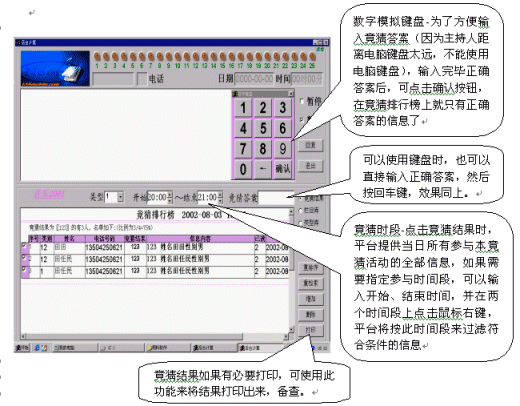 竟猜前必須對(duì)聽(tīng)眾廣播,為了竟猜的準(zhǔn)確性,希望發(fā)送信息時(shí),必須把竟猜結(jié)果發(fā)送在前面, 如(12345姓名李立),否則,系統(tǒng)將不能識(shí)別其答案。竟猜結(jié)束時(shí),只要點(diǎn)擊竟猜結(jié)果選項(xiàng),系統(tǒng)會(huì)自動(dòng)將所有參與本節(jié)目的竟猜結(jié)果統(tǒng)計(jì)出來(lái)(此時(shí)沒(méi)有限制時(shí)間段),如果需要限制時(shí)間段,則應(yīng)在"開(kāi)始"、"結(jié)束"時(shí)間段中輸入開(kāi)始和結(jié)束的時(shí)間,并在其中任何一個(gè)時(shí)間段上點(diǎn)擊鼠標(biāo)右鍵,系統(tǒng)將會(huì)自動(dòng)過(guò)濾出符合條件的信息。