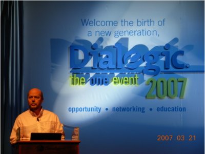 大會首先由Dialogic公司的全球資深副總裁 James Besley致辭!拔覀兓貋砹!”,James一句意味深長的開場白引來了全場長時間的熱烈鼓掌。是的,曾幾何時,Dialogic在全球CTI領域是何等的輝煌,上個世紀九十年代他們?nèi)〉眠^驕人的業(yè)績,占據(jù)了全球市場的絕大部分份額,稱之為當時CTI行業(yè)的先驅和領導者實不為過。