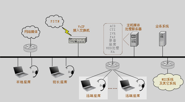 在本次客戶服務(wù)中心系統(tǒng)升級(jí)中,我們采用了更加先進(jìn)的第四代呼叫中心系統(tǒng)作為客服系統(tǒng)的平臺(tái)?梢詫(shí)現(xiàn)的客戶聯(lián)絡(luò)方式已經(jīng)不僅僅局限于傳統(tǒng)的語(yǔ)音和傳真的呼叫形式,網(wǎng)絡(luò)電話、網(wǎng)絡(luò)傳真、Email、短消息、即時(shí)消息、互聯(lián)網(wǎng)應(yīng)用等都是與客戶聯(lián)絡(luò)的重要方式,涉及到的媒體載體也不僅是PSTN,還有基于VoIP技術(shù)的現(xiàn)代網(wǎng)絡(luò)、無(wú)線網(wǎng)絡(luò)等;也就是說(shuō)第四代呼叫中心系統(tǒng)是一個(gè)融合網(wǎng)絡(luò)、語(yǔ)音、數(shù)據(jù)庫(kù)、視頻和安全技術(shù)的綜合信息服務(wù)平臺(tái)。系統(tǒng)結(jié)構(gòu)圖如下: