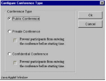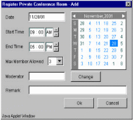 TeleConference系統(tǒng)內(nèi)的任一個分機(jī),都可以利用瀏覽器(Internet Browser)來預(yù)約會議時間,而參加會議的人可以在會議開始時,自動打電話進(jìn)系統(tǒng)參加會議就像加入“聊天室“一樣簡單。