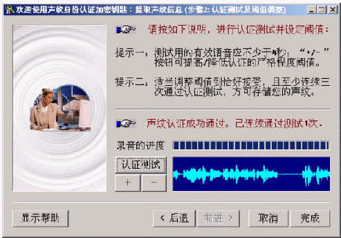 點(diǎn)擊"認(rèn)證測(cè)試"按鈕并說出含有4秒有效語(yǔ)音的任意一段話,系統(tǒng)據(jù)此進(jìn)行身份認(rèn)證,并顯示在當(dāng)前的"嚴(yán)格程度閾值"下的認(rèn)證結(jié)果("通過"或"被拒絕")。根據(jù)這個(gè)結(jié)果,可利用"+/-"按鈕將這個(gè)閾值適當(dāng)?shù)卣{(diào)高(如果結(jié)果是"通過")或調(diào)低(如果結(jié)果是"拒絕")一些或不做調(diào)整。請(qǐng)注意:該閾值越大,后續(xù)的聲紋認(rèn)證就越嚴(yán)格,反之則越寬松。