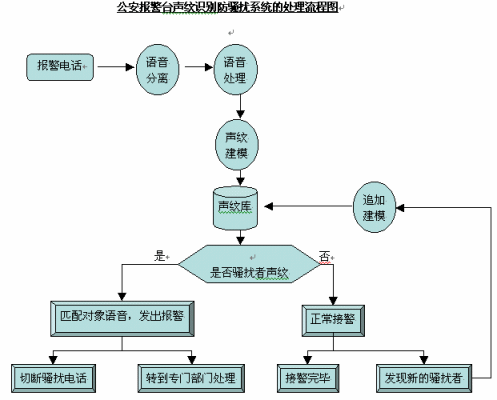 公安報(bào)警臺(tái)聲紋識(shí)別防騷擾系統(tǒng)的處理流程為: