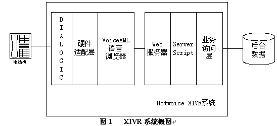 采用Hotvoice XIVR系統(tǒng)實(shí)現(xiàn)的新業(yè)務(wù)可以采用任何Web技術(shù)方便地和原有數(shù)據(jù)系統(tǒng)結(jié)合。用戶可以根據(jù)業(yè)務(wù)需求編寫靜態(tài)voiceXML腳本,或采用ASP/JSP/PHP等動(dòng)態(tài)生成voiceXML腳本;與后臺(tái)數(shù)據(jù)系統(tǒng)間可以采用數(shù)據(jù)庫(kù)訪問,或采用XML/HTTP/DCOM或其他協(xié)議訪問。