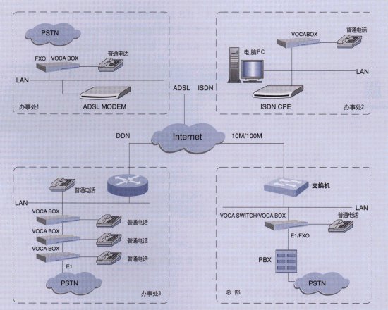在總部、各個分公司、辦事處按照容量的大小可以安裝多臺VOCABOX,并利用VOCABOX自帶的FXO接口與本地PSTN網互通。