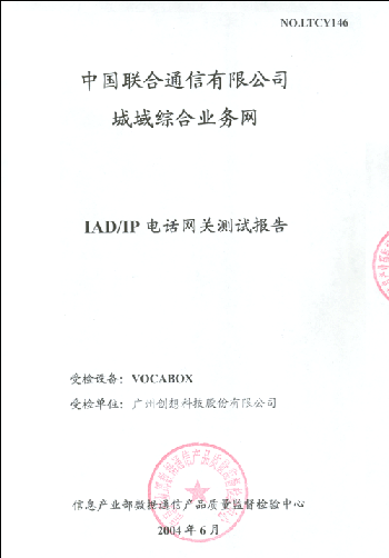 。。近日,廣州創(chuàng)想科技股份有限公司得到信產(chǎn)部數(shù)據(jù)通信產(chǎn)品質(zhì)量監(jiān)督檢測(cè)中心的通知:VOCABOX/IAD通過了中國(guó)聯(lián)通城域綜合業(yè)務(wù)網(wǎng)IAD/IP電話語音網(wǎng)關(guān)入圍測(cè)試。