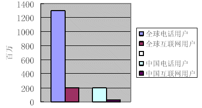 悠久的歷史使電話無疑是最普及的通訊工具,其操作簡(jiǎn)易性更是老少皆宜。如下圖所示,盡管互聯(lián)網(wǎng)方興未艾,然而在全球范圍內(nèi),電話用戶的數(shù)量仍數(shù)倍于互聯(lián)網(wǎng)用戶,在中國(guó)更是達(dá)到10倍以上。特別是,近年來移動(dòng)通訊發(fā)展迅猛,移動(dòng)電話的銷售量已超過汽車和PC 機(jī)的總和,預(yù)計(jì)2003年末全球移動(dòng)用戶數(shù)將突破10億。