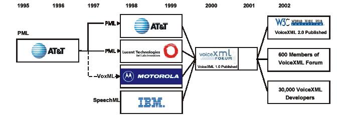 VoiceXML 是由IBM 、Lucent、Motorola 和AT&T 四家公司于2000年提出的一種應(yīng)用于語音瀏覽的標(biāo)記語言。如下圖所示,VoiceXML是各廠商多年經(jīng)驗(yàn)積累的產(chǎn)物,VoiceXML Forum更是得到業(yè)界廣泛的支持,同時(shí)VoiceXML由W3C組織標(biāo)準(zhǔn)化,成為事實(shí)上的工業(yè)標(biāo)準(zhǔn)。
