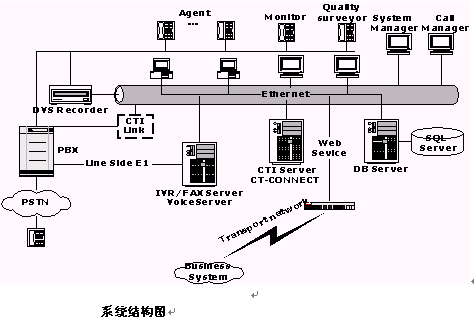 交換機(jī)實(shí)現(xiàn)電話呼入、呼出功能;還需要提供自動(dòng)排隊(duì)機(jī)系統(tǒng),用于實(shí)現(xiàn)對(duì)來話的均衡分配;呼叫管理系統(tǒng),用于有效管理所有話務(wù);支持IVR;提供CTI Link模塊作為計(jì)算機(jī)/電話集成接口;同時(shí),交換機(jī)還可作為辦公電話交換機(jī)使用,系統(tǒng)可支持多家公司的交換機(jī)。