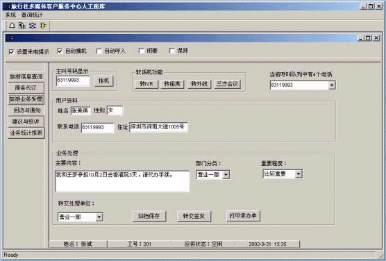 旅行社客戶(hù)服務(wù)中心系統(tǒng)將接入功能、導(dǎo)航功能、自動(dòng)語(yǔ)音查詢(xún)功能、人工座席服務(wù)功能、話路轉(zhuǎn)接功能、信息資料處理緊密聯(lián)系起來(lái)。用戶(hù)撥打特服電話號(hào)碼后,可以根據(jù)需要選擇人工服務(wù)、自動(dòng)語(yǔ)音查詢(xún)、自動(dòng)留言,并能夠在幾種服務(wù)中來(lái)回切換或轉(zhuǎn)接其它電話;所記錄的資料可以分門(mén)別類(lèi)的進(jìn)行統(tǒng)計(jì)并形成報(bào)表,供相關(guān)部門(mén)進(jìn)行檢索查閱;意見(jiàn)處理完畢,可由座席主動(dòng)呼叫用戶(hù),告知處理意見(jiàn),形成閉環(huán)處理流程;從而打造全新的客戶(hù)服務(wù)形象。