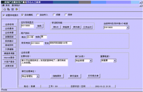 。。接通呼叫中心的電話后,按語音提示選擇相應(yīng)的服務(wù),選擇相應(yīng)的服務(wù)功能鍵后,在服務(wù)人員的計(jì)算機(jī)屏幕上自動彈出對話框顯示用戶的詳細(xì)信息。