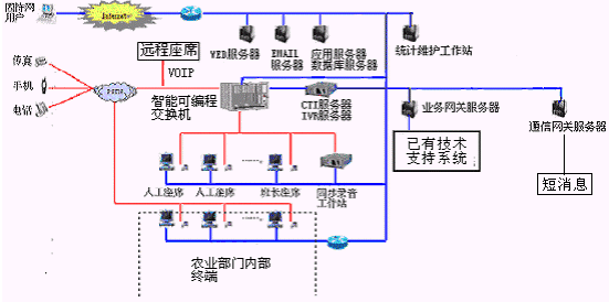 客戶利用電話、傳真、手機(jī)等撥打統(tǒng)一的特服號碼(如800XXX或9XXXX)或因特網(wǎng)進(jìn)入農(nóng)業(yè)分布式呼叫中心,本系統(tǒng)依托農(nóng)業(yè)部門各類計(jì)算機(jī)業(yè)務(wù)技術(shù)支持系統(tǒng)和網(wǎng)絡(luò)系統(tǒng),實(shí)現(xiàn)與農(nóng)業(yè)部門原有管理系統(tǒng)/業(yè)務(wù)系統(tǒng)及數(shù)據(jù)庫的無縫連接,通過人工受理或自動(dòng)語音服務(wù)等方式全天24小時(shí)不間斷地為客戶提供各種服務(wù)。