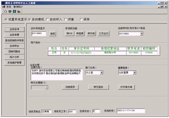 客戶打入電話后,當(dāng)系統(tǒng)的自動(dòng)語音應(yīng)答子系統(tǒng)無法解決客戶問題時(shí),客戶可選擇人工服務(wù),由客戶服務(wù)代表直接接聽客戶電話,處理并解決客戶問題。此時(shí)客戶同座席話務(wù)人員直接溝通,并同時(shí)記錄下該客戶的聯(lián)系方式,將相關(guān)數(shù)據(jù)添加入系統(tǒng)數(shù)據(jù)庫;也可以在數(shù)據(jù)庫的支持下處理傳真業(yè)務(wù),電子郵件,計(jì)算機(jī)文件傳輸、滿意度調(diào)查等。