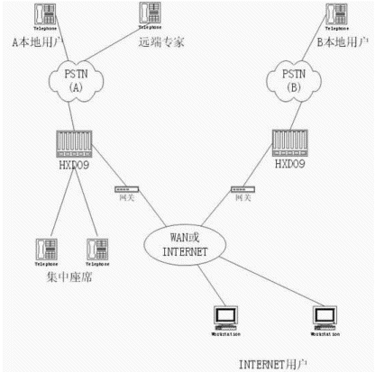 等接口實(shí)現(xiàn),每條話路只須8Kbit/s帶寬,并支持網(wǎng)絡(luò)優(yōu)化路由及D通道座席預(yù)約,大大降低網(wǎng)絡(luò)連接費(fèi)用,提高運(yùn)行效率。目前主流的方式是采用VoIP技術(shù)。物理鏈路利用集團(tuán)的專用廣域網(wǎng)絡(luò)。