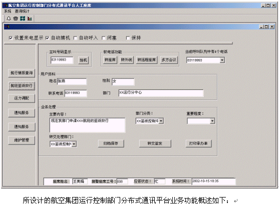 航空集團(tuán)運(yùn)行控制部門分布式通訊平臺(tái)系統(tǒng)的軟件設(shè)計(jì)采用業(yè)界先進(jìn)的三層CLIENT/SERVER體系結(jié)構(gòu),集目前先進(jìn)的計(jì)算機(jī)技術(shù)、通信技術(shù)、計(jì)算機(jī)電信集成(CTI)技術(shù)、呼叫接入技術(shù)、智能接入交換分配技術(shù)、數(shù)字語音處理技術(shù)、異構(gòu)系統(tǒng)信息交互技術(shù)、安全容錯(cuò)技術(shù)、網(wǎng)絡(luò)組網(wǎng)技術(shù)等于一體,并與航空集團(tuán)運(yùn)行控制部門已有技術(shù)支持系統(tǒng)(如飛行運(yùn)行控制系統(tǒng)、航路計(jì)劃系統(tǒng))緊密結(jié)合在一起,突破時(shí)空的限制,通過人工座席、自動(dòng)語音/傳真、相關(guān)部門工作人員等為集團(tuán)內(nèi)部提供電話、傳真服務(wù)形式的周到、快捷、全方位的通信服務(wù)。