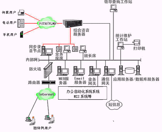 整個(gè)多媒體呼叫中心系統(tǒng)對(duì)外面向用戶,對(duì)內(nèi)與整個(gè)市勞動(dòng)局相聯(lián)系,與內(nèi)部管理/服務(wù)等結(jié)為一體,能夠把從用戶那里獲得的各種信息、數(shù)據(jù)全部貯存在龐大的數(shù)據(jù)倉庫中,供領(lǐng)導(dǎo)者作分析和決策之用;形成了對(duì)外服務(wù)于客戶,對(duì)內(nèi)管理、分析、決策系統(tǒng)相結(jié)合的多媒體呼叫中心。