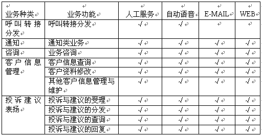 本系統(tǒng)具有自動(dòng)語音服務(wù)、人工坐席服務(wù)、呼叫轉(zhuǎn)接分發(fā)、信息咨詢、信息查詢、客戶投訴建議、通知服務(wù)、因特網(wǎng)服務(wù)、管理人員對(duì)語音記錄的查詢、外包業(yè)務(wù)、增值服務(wù)等功能,并且結(jié)合圖形化的管理、監(jiān)控界面,使得客戶隨時(shí)隨地可以利用身邊的各種通訊工具獲得本公共呼叫中心平臺(tái)的方便快捷的服務(wù)。