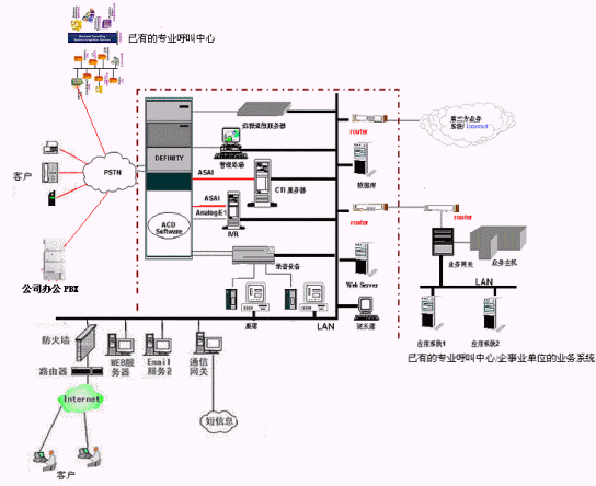 實(shí)現(xiàn)共享已有呼叫中心業(yè)務(wù)系統(tǒng)的資源:通過城域網(wǎng)或因特網(wǎng)實(shí)現(xiàn)與現(xiàn)有呼叫中心相關(guān)業(yè)務(wù)系統(tǒng)的連接與集成,諸如業(yè)務(wù)數(shù)據(jù)的提取等。一期工程留有相應(yīng)的接口。