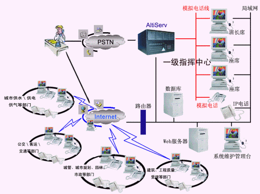 在建設12319時,將整個熱線系統(tǒng)構架分成三級網(wǎng)絡結(jié)構,一級網(wǎng)絡指揮中心為城市提供了一個電子化(語音、Internet等)的服務窗口,它是以12319作為電話接入的系統(tǒng)號碼,幫助城市改善傳統(tǒng)的服務方式,為市民提供多種渠道和政府進行溝通,該級系統(tǒng)建立在奧迪堅AltiServ平臺之上,采用多路并發(fā)IVR自動語音應答資源,各城市可以進行依據(jù)自己的需要進行個性化的IVR應用,為用戶提供人工接聽及語音自助服務。除此之外,在一級網(wǎng)絡指揮系統(tǒng),AltiServ的IP分布式呼叫中心平臺還提供一系列先進功能,其中包括:自動話務分配、VoIP功能、語音信箱、文本轉(zhuǎn)語音(TTS)、電話會議、錄音管理、CDR(通話詳細報告)等,方便指揮中心集中受理群眾建議,發(fā)布指令以及發(fā)揮監(jiān)督等作用。