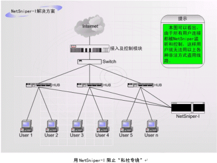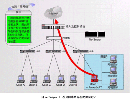 上圖中,NetSniper-II可以對(duì)網(wǎng)絡(luò)內(nèi)部各用戶進(jìn)行檢測(cè),一旦發(fā)生某個(gè)用戶安裝代理服務(wù)器軟件,其他用戶通過該用戶的接口上網(wǎng)偷逃網(wǎng)費(fèi)的情況,或發(fā)現(xiàn)盜用MAC地址上網(wǎng)及通過Modem回?fù)苌暇W(wǎng)的情況,NetSniper-II即可定位這些用戶,并且采取通知系統(tǒng)管理員或自動(dòng)封堵非法用戶等措施。
