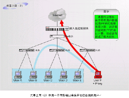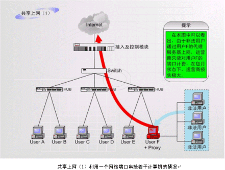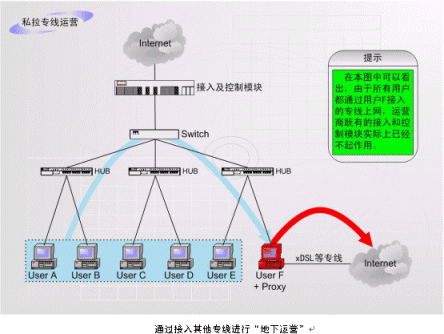 非法運(yùn)營(yíng)情況之二:如上圖中的F用戶作為運(yùn)營(yíng)商的合法包月用戶,上網(wǎng)服務(wù)開通以后,在自己的計(jì)算機(jī)中安裝代理服務(wù)軟件或者安裝路由器,這樣就可以隨時(shí)糾集若干住戶分?jǐn)偘沦M(fèi)用,甚至私設(shè)網(wǎng)吧。
