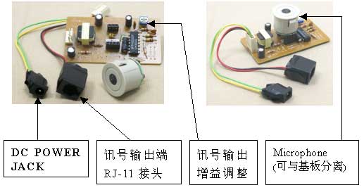電氣特性 | MIC:電容式麥克風(fēng) MIC靈敏度:-63 dbm 輸出阻抗:10KΩ 輸出接頭:RJ-11 放大增益:0 ~ 10倍 電源:DC 12V;2.5 mA 電源接頭:DC Power Jack |