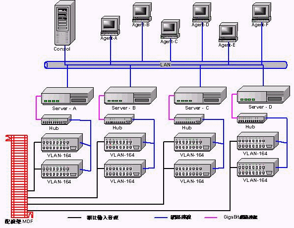 - 系統(tǒng)主要包括二大主機并由網絡聯(lián)機(TCP/IP協(xié)議)作為彼此與遠程的溝通橋梁。一是錄音接口主機(VLAN-164)具備模擬輸入音源的匹配接口、音源數字化、網絡聯(lián)機輸出。一是數據庫服務器(DataBase