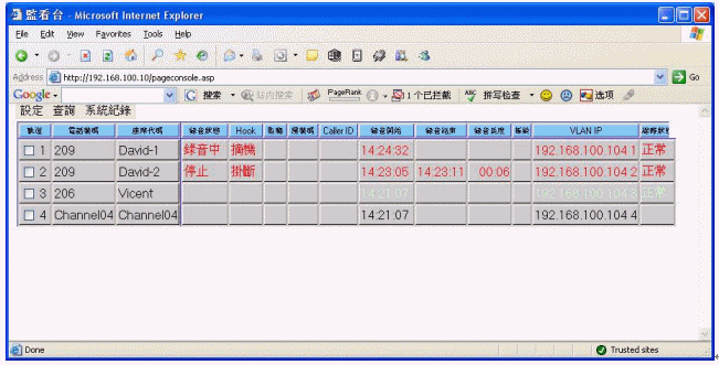 監(jiān)看臺:系統(tǒng)登入后的主畫面,可以監(jiān)控各路電話的當前使用情況(包括來電號碼、去電號碼、振鈐次數、錄音開始時間、錄音結束時間、線路狀況等信息)。并可以實現(xiàn)對任意通話的網絡實時監(jiān)聽。