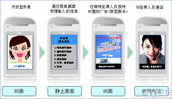 以往的IVR根據(jù)選擇項(xiàng)、層數(shù),必須多遍聽取語(yǔ)音內(nèi)容才能找到預(yù)期的菜單,成了一大課題。視頻呼叫中心則在FOMA的畫面上顯示服務(wù)菜單,通過(guò)選擇號(hào)碼可以簡(jiǎn)化聽取語(yǔ)音的過(guò)程。而且,在連接客服人員的電話等待時(shí)間中可以播放廣告。通過(guò)靈活運(yùn)用這些功能,提高了IVR的操作性,提供了新型廣告宣傳的機(jī)會(huì)。