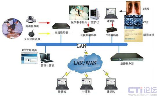同時,銳取多媒體系統(tǒng)前端VGA編碼器將采集到的計算機(jī)信號(包含通過網(wǎng)絡(luò)訪問的DR/CR片、CT片)進(jìn)行實(shí)時編碼和壓縮,通過網(wǎng)絡(luò)與高清視音頻信號以及普通視音頻信號同步傳輸?shù)戒J取多媒體錄播系統(tǒng)遠(yuǎn)程醫(yī)療系統(tǒng)后臺服務(wù)器上。