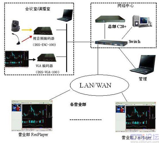 在分析了華安證券的實(shí)際需求和網(wǎng)絡(luò)環(huán)境以后,決定采用一套DSS-R-C20+來(lái)組建整個(gè)流媒體系統(tǒng)。系統(tǒng)由媒體采集系統(tǒng)視音頻編碼器(DSS-ENC-100)/VGA編碼器(DSS-ENC-100),流媒體處理和錄制系統(tǒng)(C20+)和客戶(hù)端RecPlayer組成。通過(guò)此系統(tǒng)可以實(shí)現(xiàn)語(yǔ)音、視頻和計(jì)算機(jī)桌面的同步實(shí)時(shí)直播、錄制和點(diǎn)播。系統(tǒng)的結(jié)構(gòu)圖如下: