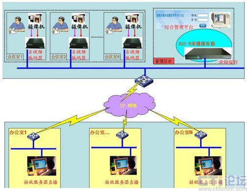基于上述的需求,經過調研選用深圳銳取錄播服務器產品完成上述的功能需求。如圖所示,通過放置在每個會議室考場內的攝像機,將竟聘者的圖像與聲音傳輸?shù)较噙B接的銳取公司的視音頻編碼器上,通過編碼器的編碼將采集的信號(通過內部網絡)傳輸?shù)胶笈_的管理平臺上的DSS-R錄播服務器中。服務器的直播模塊將從音視頻編碼器接收到的信號分發(fā)到網絡中,每個接入內網絡的辦公室內里的電腦通過專有客戶端接收考場實時內容,實現(xiàn)了真正意義上的接受機關廣大干部群眾的監(jiān)督考察。同時錄播服務器內置的錄制模塊,將收到的信號內容解碼錄制保存(服務器內有可供存儲的硬盤),為日后干部的選擇做到了有理可依,有據(jù)可查。