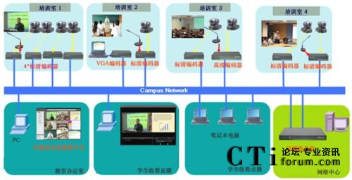 在南洋理工的商學(xué)院中有一個(gè)培訓(xùn)中心,培訓(xùn)中心中有4個(gè)培訓(xùn)課室。 商學(xué)院的老師們希望可以把這4培訓(xùn)課室中的培訓(xùn)課程錄制下來,并可以同時(shí)直播到其它教室。老師可以監(jiān)控這4個(gè)培訓(xùn)課室的培訓(xùn)情況。學(xué)生可以使用PC通過校園網(wǎng)收看到實(shí)時(shí)的培訓(xùn)情況,及培訓(xùn)后的回放他們可能錯(cuò)過了的培訓(xùn)。系統(tǒng)可與NTU現(xiàn)有的E_learning系統(tǒng)無縫融合,為為豐富E_learning的課件資源提供低成本、高效率的制作手段。同時(shí)系統(tǒng)應(yīng)該便于維護(hù)及用戶界面友好,而且便于以后的擴(kuò)容。因培訓(xùn)室的功能差異,每一間培訓(xùn)室內(nèi)所需記錄的信號類型及數(shù)量均不相同,要求系統(tǒng)能夠進(jìn)行匹配和適應(yīng)。