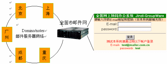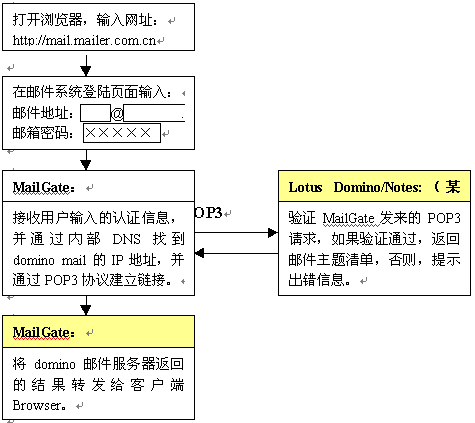 (1) 在不改變現(xiàn)有網(wǎng)絡(luò)硬件、軟件環(huán)境的情況下,添加一臺郵件網(wǎng)關(guān)服務(wù)器,通過統(tǒng)一的web登陸界面,輸入Email地址和密碼后,金笛?郵件網(wǎng)關(guān)會自動根據(jù)內(nèi)部DNS找到該用戶所在的Domino Mail Server, 并通過標準郵件協(xié)議POP3提取該用戶的郵件,以web頁面形式顯示在用戶屏幕上。